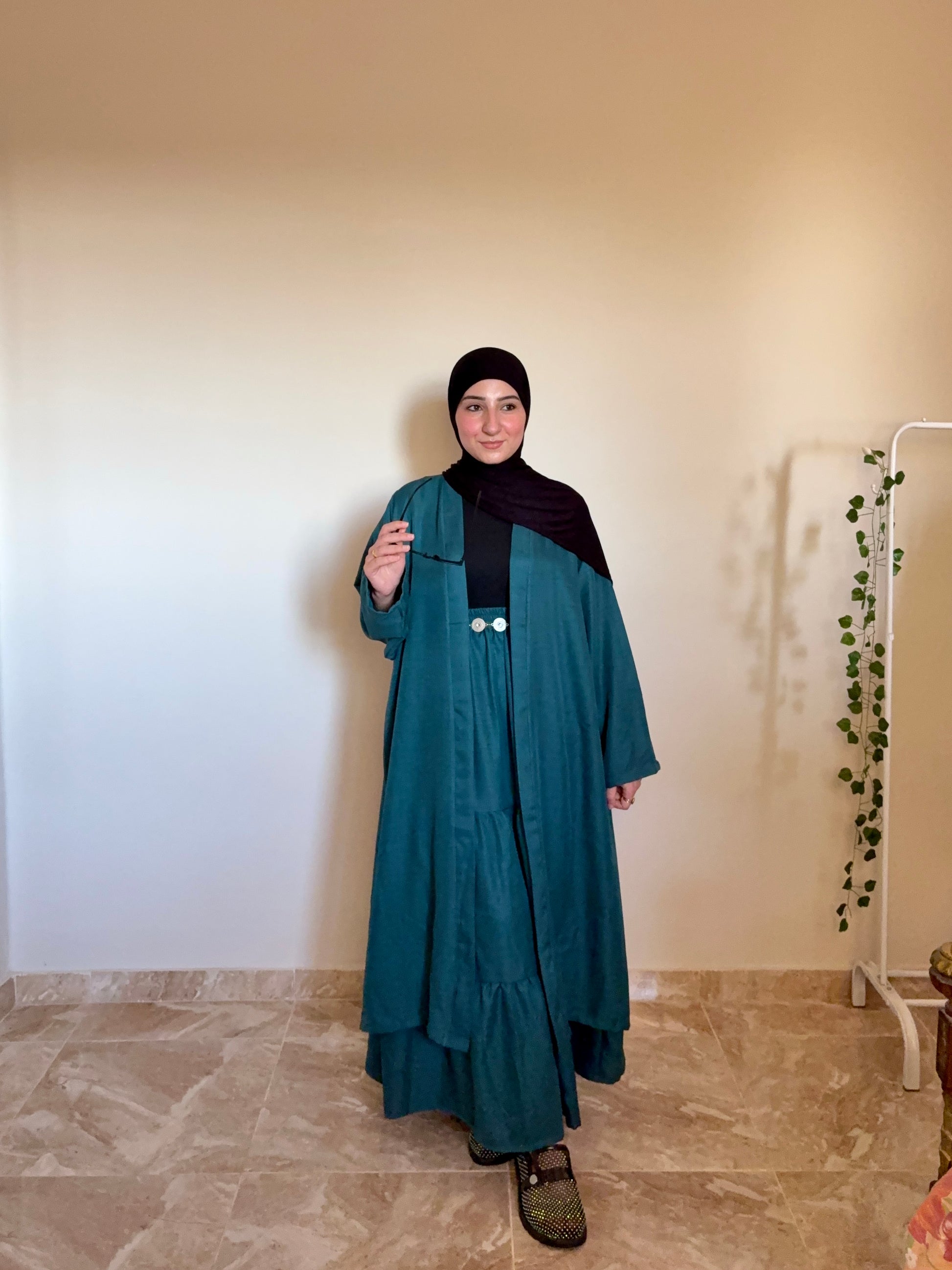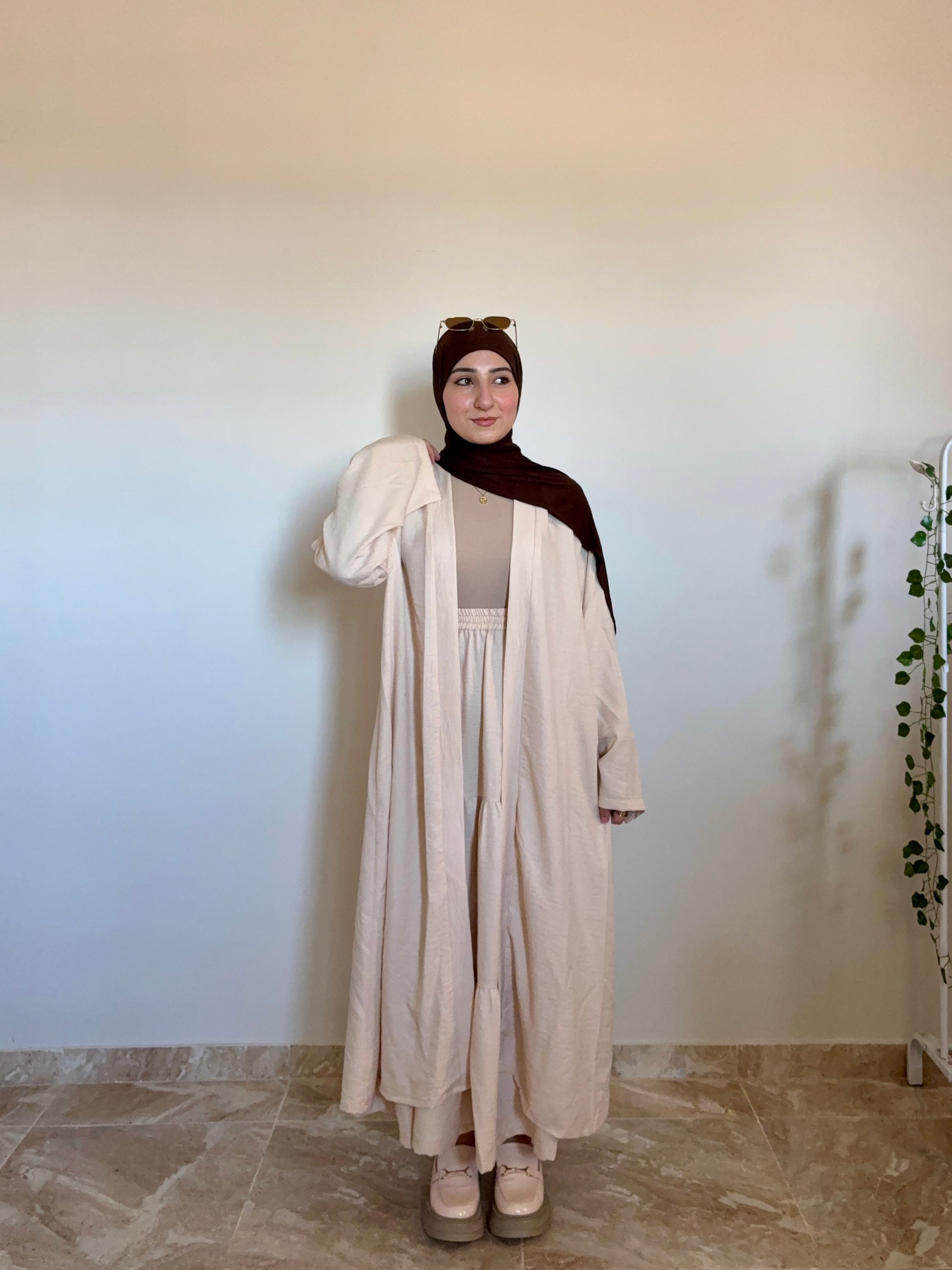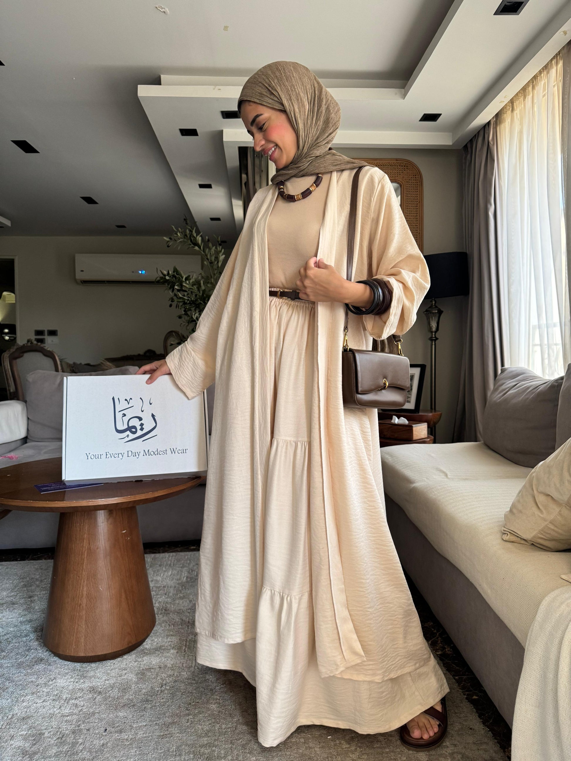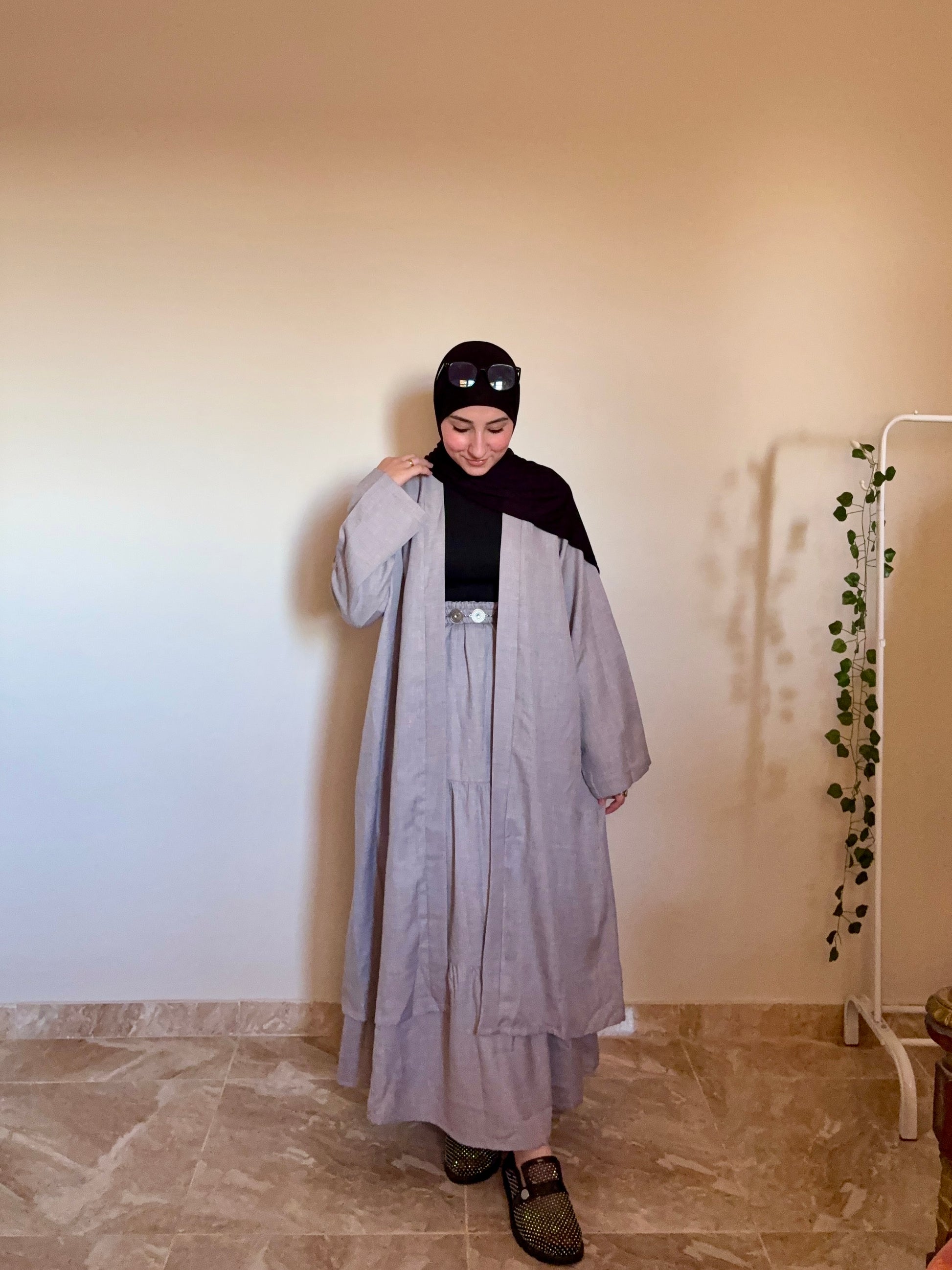 عبارة عن جيبة كلوش واسعة ، ومعاها كارديجان طويل بنفس اللون، وكمان حزام منفصل تقدري تلبسيه أو تسيبيه حسب استايلك.